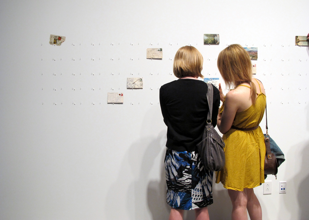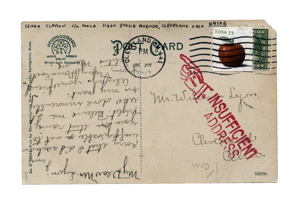 74 postcards found their destination (again), 26 were returned to the return address at MOCA Cleveland where they were displayed in a numbered grid in the gallery. These returned postcards came back bearing the evidence of their second postal processing; double postmark rings, rubber-stamped “Insufficient postage” and handwritten codes and crossings out. The other postcards were perhaps received once again many years later by their original recipient, or by their children, or the people who have since moved into their house. A message from the past read again by perhaps the same, older eyes.