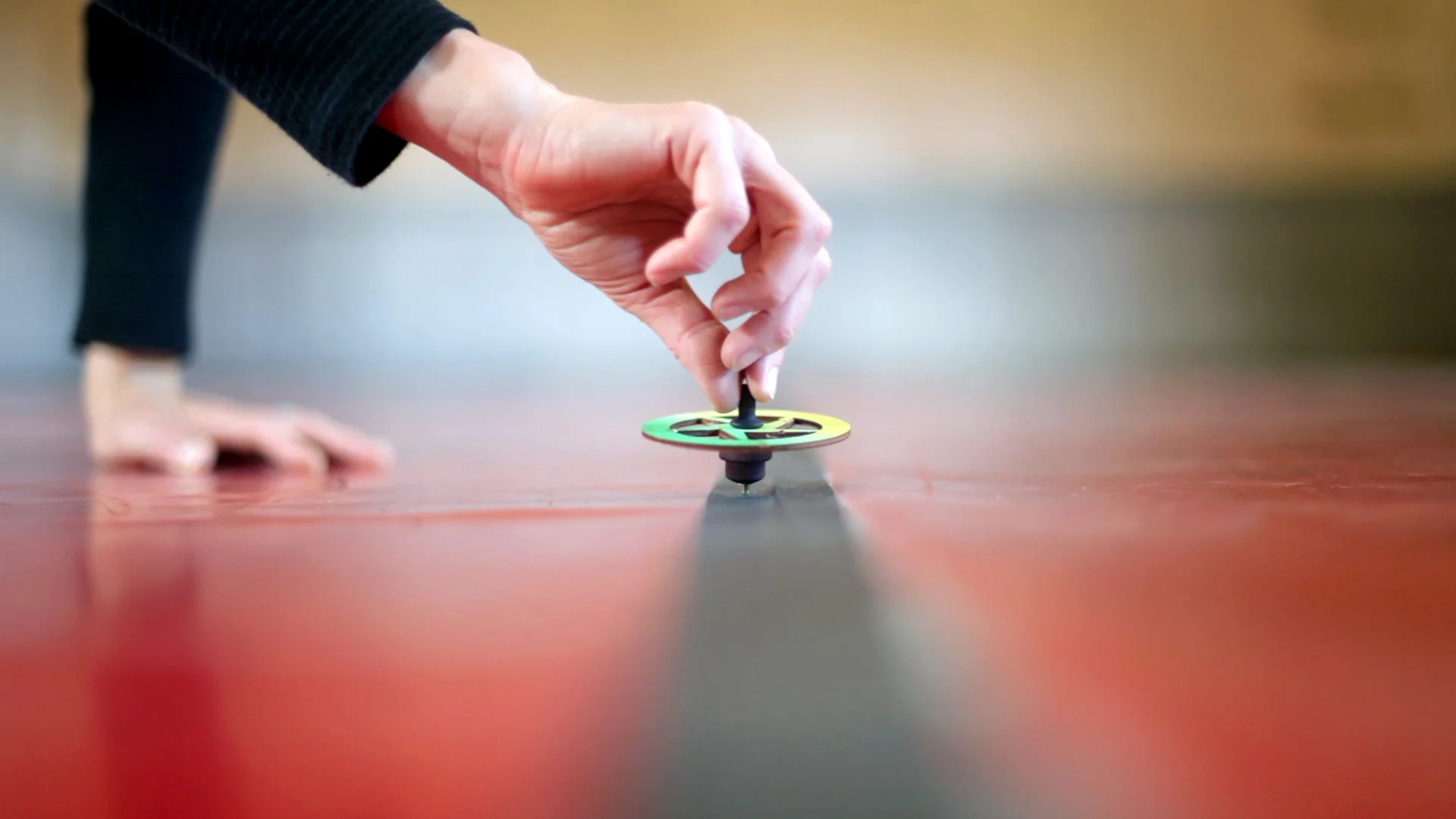 Performing artist Monique Jenkinson improvised a choreography in response to the movement of the spinning top and found objects from her studio.